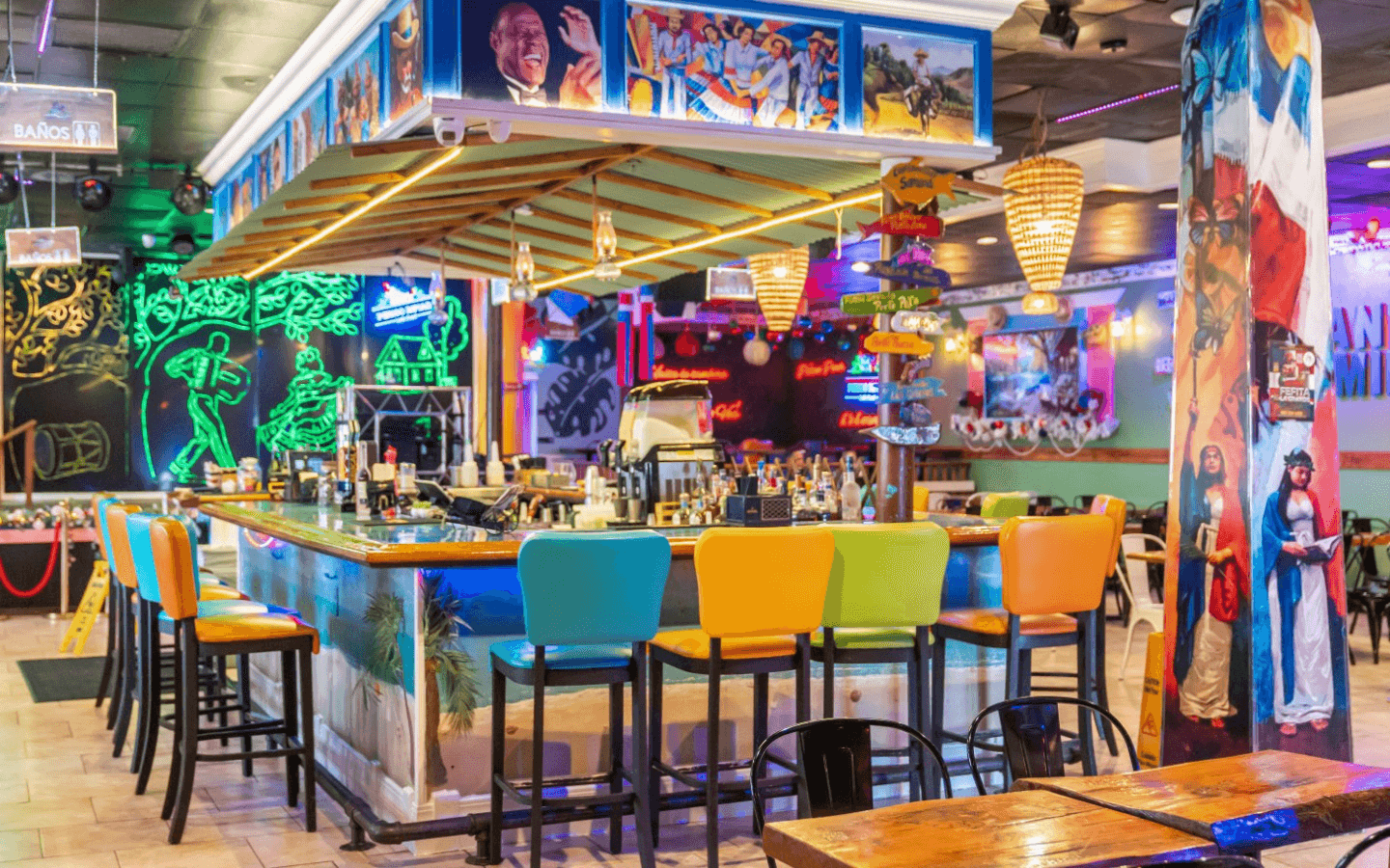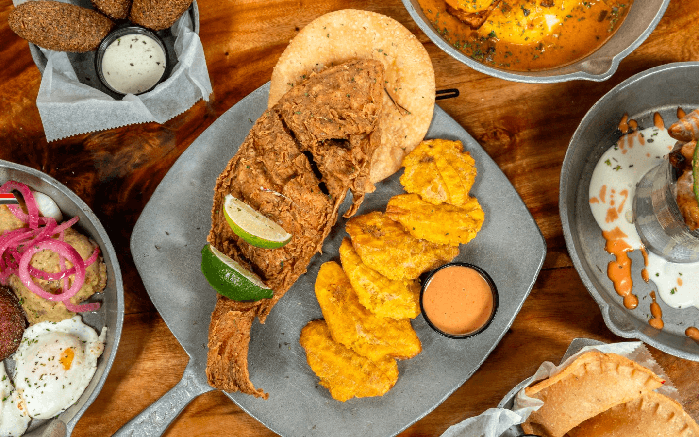 Vibrant plates, golden fried treats, and refreshing cocktails set against a lively Dominican backdrop